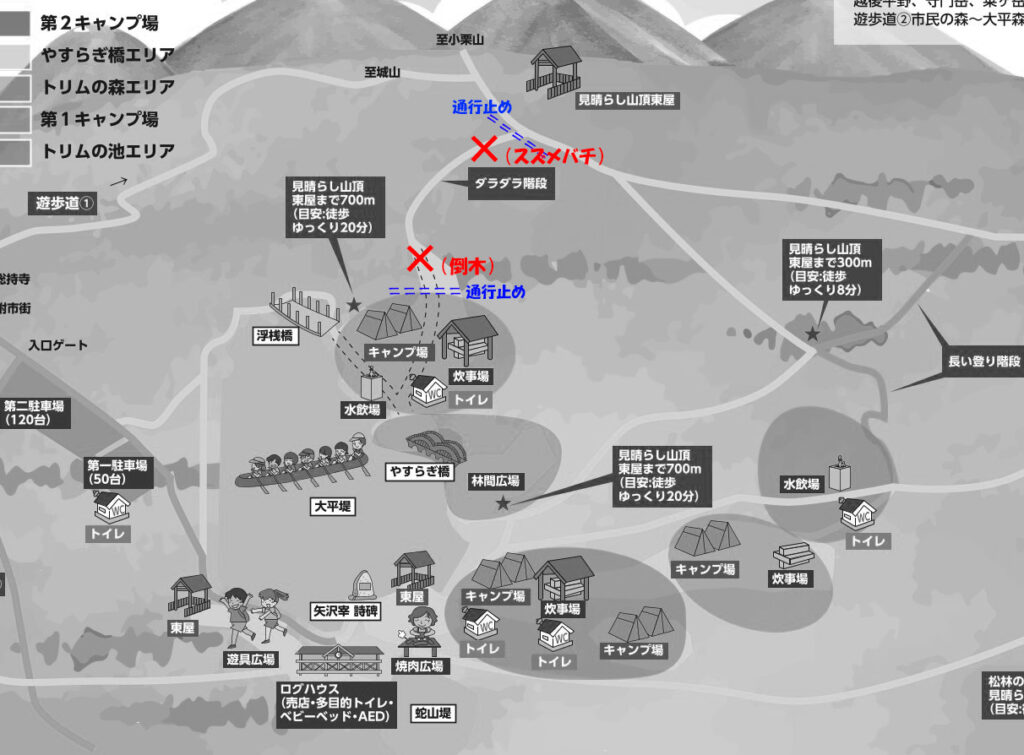 これを受けて現地確認を行ったところスズメバチを確認、及び遊歩道手前(キャンプ場側)に倒木もあった為、安全が確認されるまで一部通行止めと致しました。